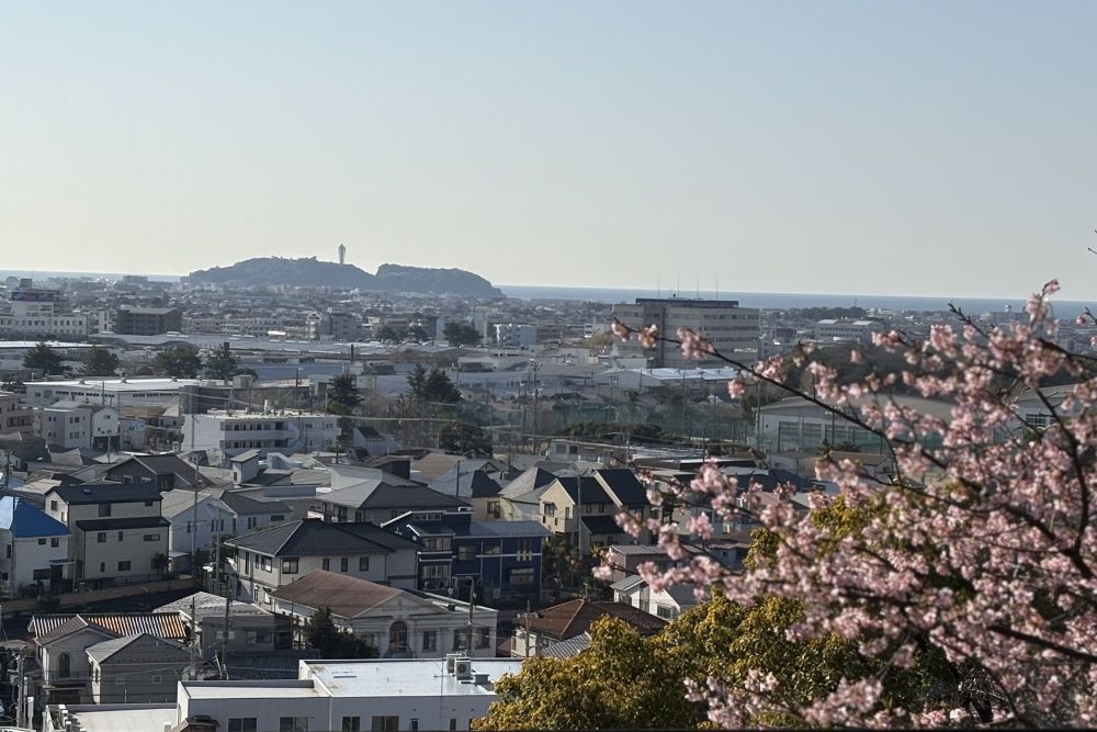 見晴らし台からは江の島が見えます。その昔、伊勢参りに行けない人々がこの山から伊勢神宮に向かって参拝したことから、この名が付きました。今でもお天気の良い日には、西に向かう方向に富士山を見つけることができます。