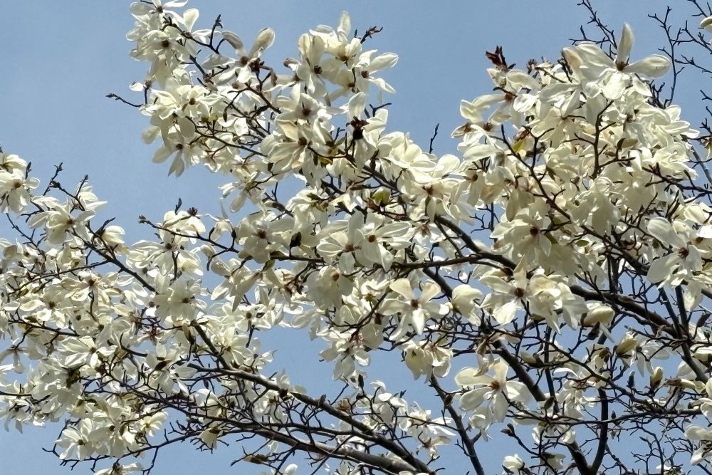 こぶし~ほぼ同じころ咲くハクモクレンと似ていますが、見分け方は花びらの枚数です。こぶしが6枚に対して、ハクモクレンは萼も花びら並に大きく目立つため、花びらの様に見えるものが全部で9枚あります。