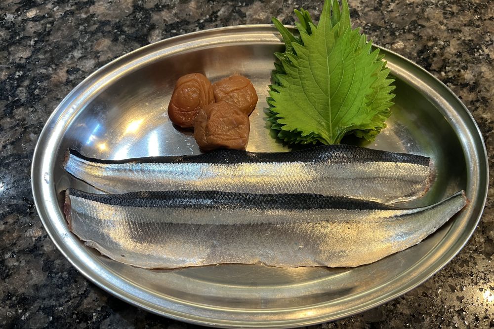 2.梅干しを叩いてペーストにし、大葉と一緒にサンマにのせる。