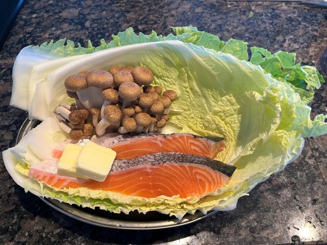 1.鮭を一口大に切り、白菜をざく切りにし、キノコは食べやすく分ける。