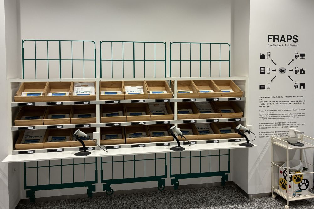 見学を終えた最後には、オリジナルグッズがお土産としてもらえます。実際の物流現場で使われている独自規格の流動型ラックによるピッキングシステム“FRAPS”使って自分で手に入れることができます。