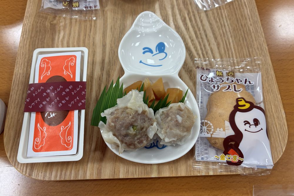 崎陽軒の歴史VTR→駅弁の歴史→シウマイ弁当のひみつをご紹介→シウマイの製造工程見学→弁当の箱詰めライン見学→しょう油入れのひょうちゃん展示→できたてのシウマイ・シウマイ弁当のおかず・お菓子の試食の流れで約1時間半の見学でした。(展示物は撮影可能ですが、工場内やVTRは撮影禁止です)