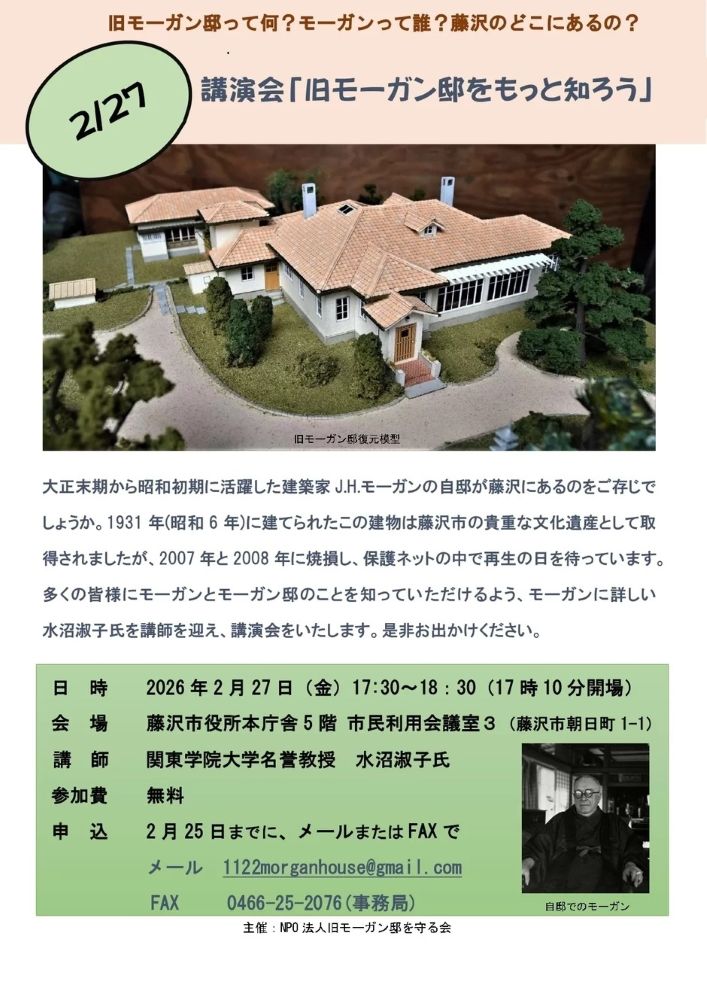 多くの皆様にモーガンとモーガン邸のことを知っていただけるよう、モーガンに詳しい水沼淑子氏を講師に迎え、講演会をいたします。是非お出かけください。