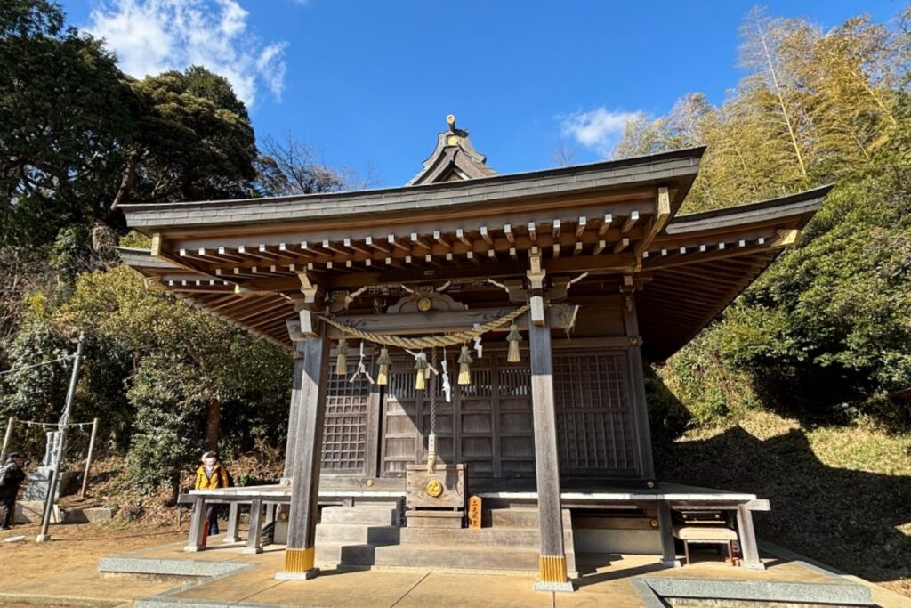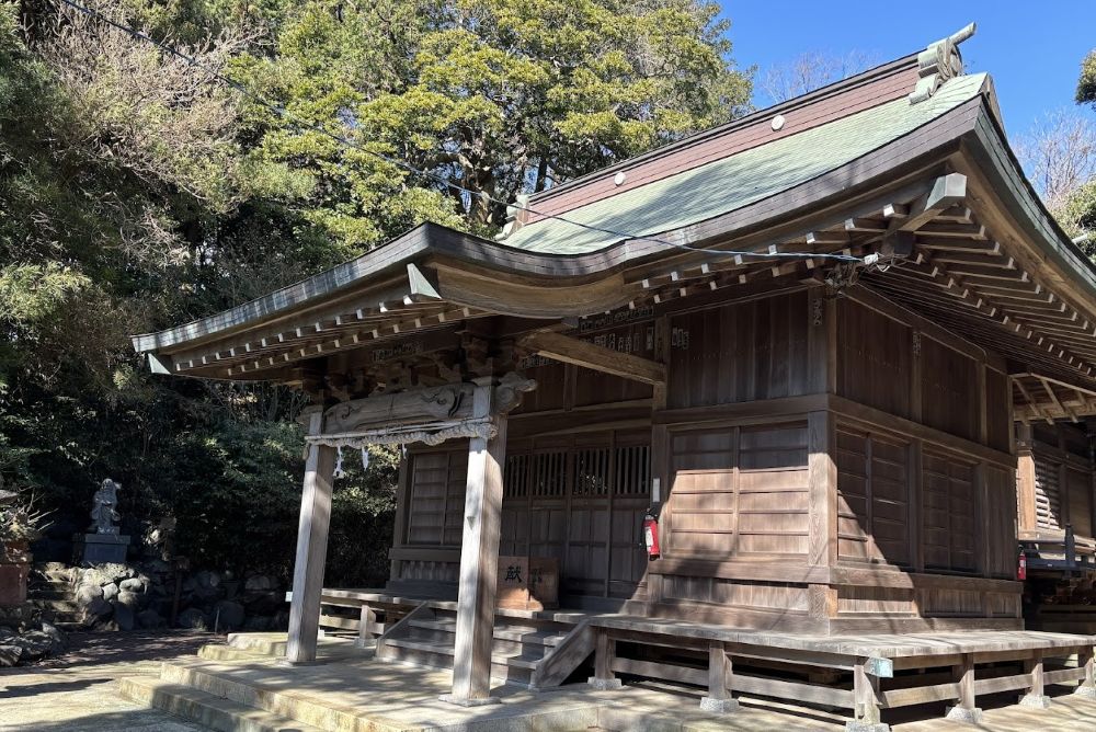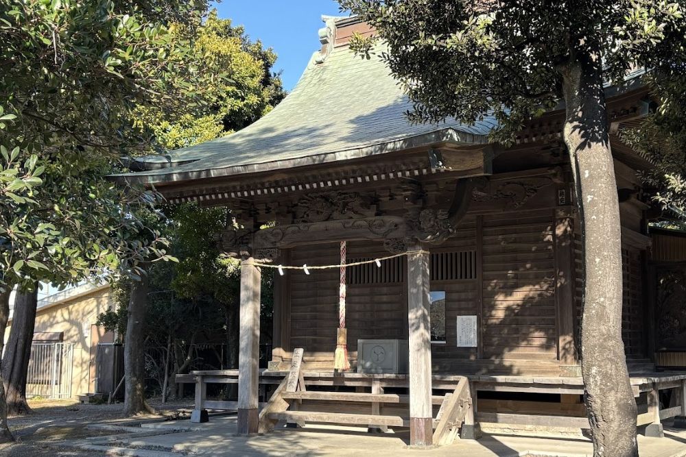 天慶4年(941)の創建といわれ、早良親王(桓武天王の同母弟)と、村岡ゆかりの武将・鎌倉権五郎景政(大庭御厨を作った人)を祭神としています。秋の例祭日には、市指定民俗文化財・川名屋台ばやしが演奏され、鎌倉権五郎の人形を乗せた山車が出てにぎわいます。