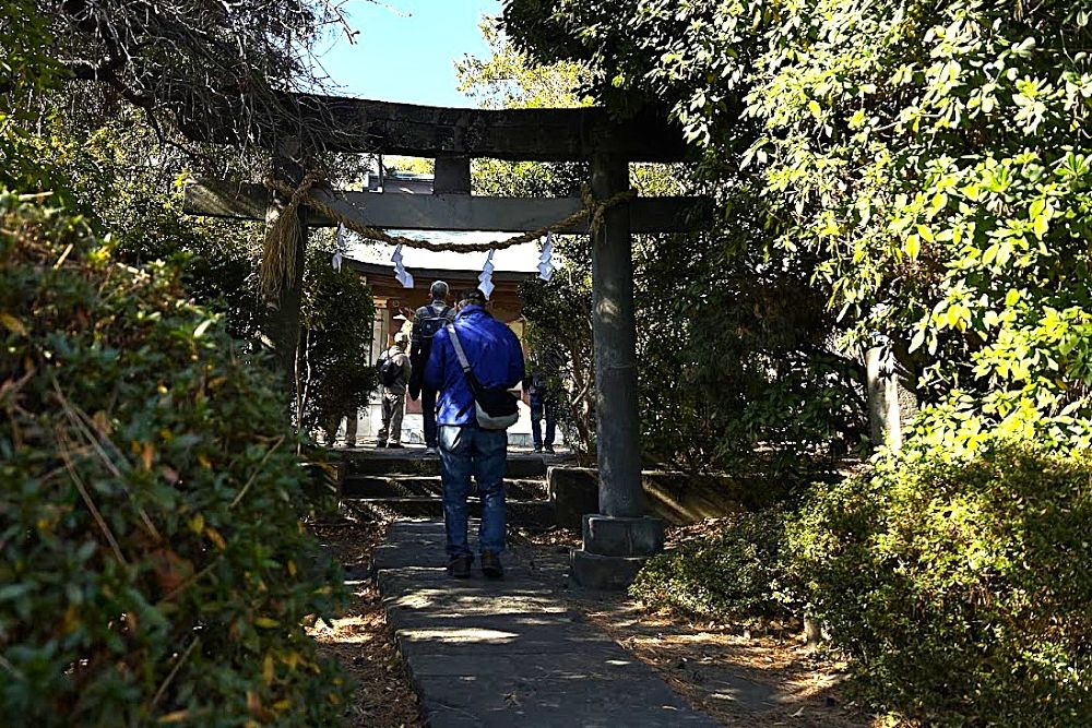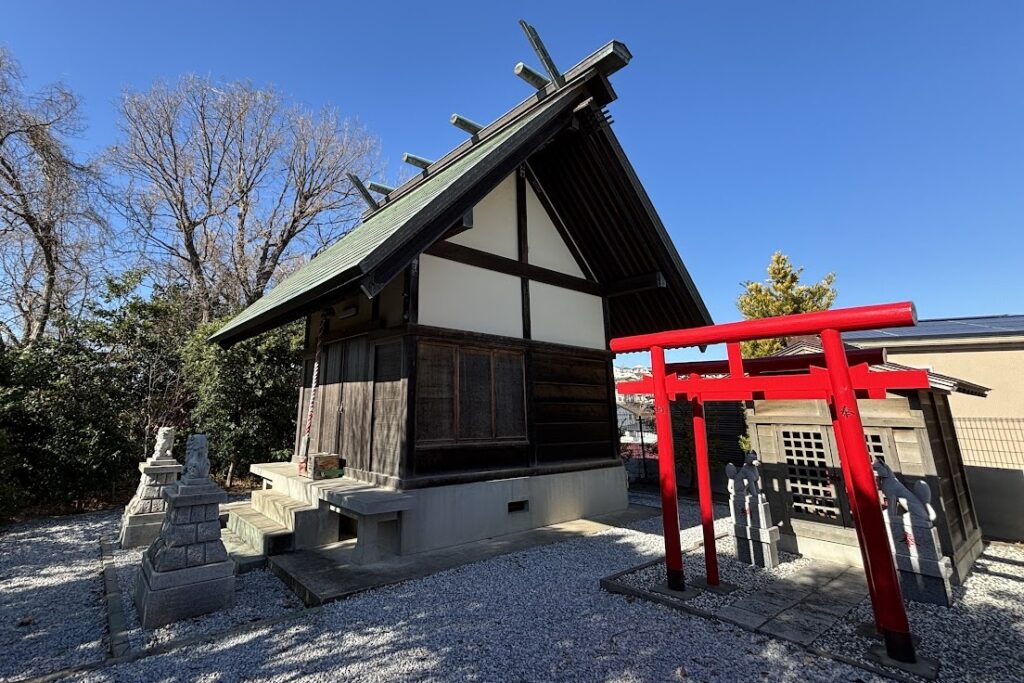 平良文が居住するにあたり屋敷の守護神として日枝大神(大山吟命)を祀ったのに始まり、応永27年(1420)福原左衛門平忠次によって現在地に遷し、そのとき良文を合祀したといわれています。石団右側には、宅地造成によって移された庚申塔や道祖神塔が一列に並び、鎌倉道の道標や「幸紙」と彫られた道祖神塔も見えます。