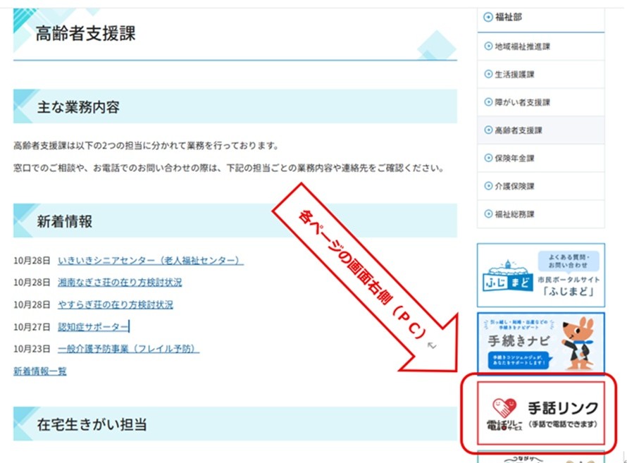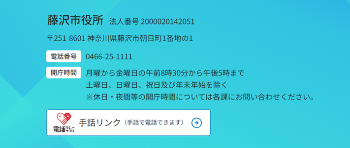 耳の聞こえない人、聞こえにくい人など、会話に手話を必要とする方が、藤沢市ホームページの専用ボタンをクリックすることで、手話通訳オペレーターを介し、手話によりお問い合わせが可能になりました。一般財団法人日本財団電話リレーサービスが提供する「手話リンク」を利用しています。